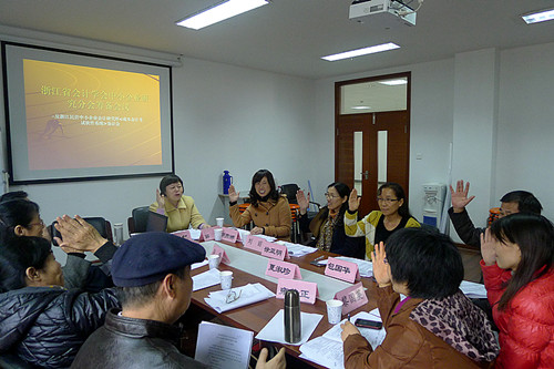 2012年12月7日下午,浙江省会计学会中小企业研究分会筹备会议暨浙江民营中小企业会计研究所《成本会计考试软件系统》研究成果鉴证会议在浙江长征职院浙江民营中小企业会计研究所(实训楼南313)举行,会议由副教授薛茹所长主持,财会学院院长高晓红教授代表学院致辞,韩锦生副教授解读了浙江省会计学会中小企业研究分会章程,徐亚明副教授、包国华教授等多位专家、学者参加了会议。本次会议就浙江省会计学会中小企业研究分会章程共八章三十四条和其它相关制度政策进行了探讨,议定了分会章程及组织机构成员;会议还为会计研究所的学生信息员颁发了聘书,为冯娟等同学颁发了优秀信息员证书;与会专家、学者还对韩锦生和薛茹副教授开发的《成本会计考试软件系统》研究成果进行鉴证并给予了高度评价。