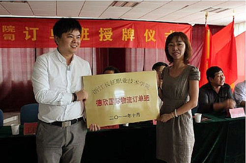 2012年5月31日下午,浙江长征职业技术学院与浙江德欣物流有限公司订单班授牌仪式在学院行政楼二楼会议室隆重举行。浙江长征职业技术学院副院长王其军、校企合作处处长张敬伟、贸易系系主任罗明、贸易系党委副书记杨现华等院系领导以及浙江德欣物流有限公司总经理王科君、销售经理莫剑峰、宁波天运国际货运代理有限公司总经理常征出席了授牌仪式,会议由校企合作处处长张敬伟主持。