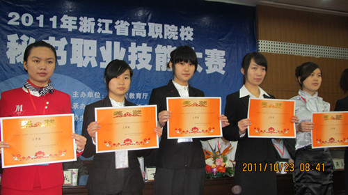 2011年10月22至23日,语言系文秘专业09级赖诚晟、殷佳、林静与10级杜盼盼、刘俊江、郭洋6位同学在黄明光老师带领下代表我院首次参加由浙江教育厅组织的浙江省高职院校文秘职业技能大赛,荣获团体三等奖。这次比赛在湖州职业技术学院举行。参加本次大赛的共有来自浙江省19所高职院校的42组选手。语言系6位同学分为两个小组参加了比赛。