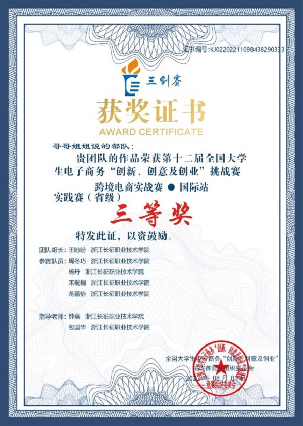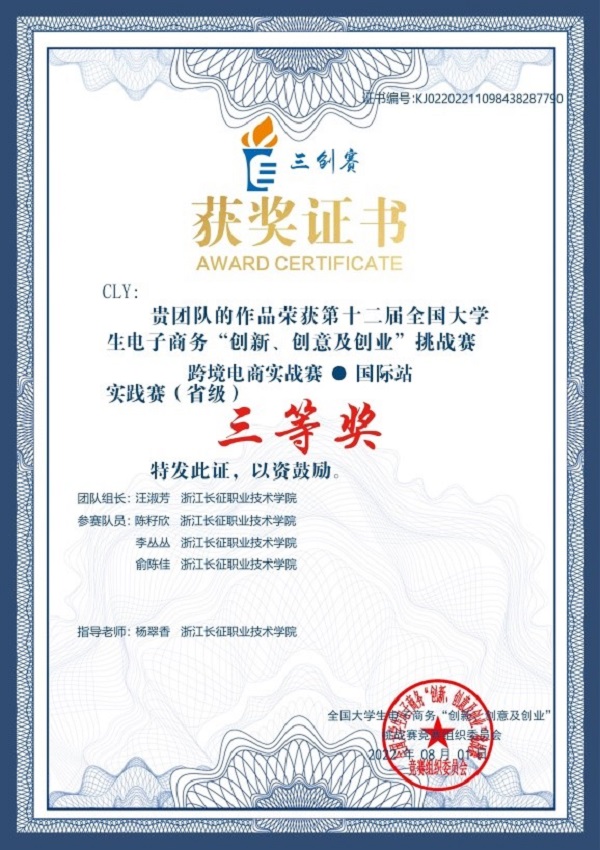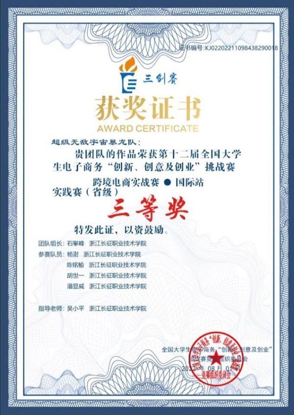 第十二届全国大学生电子商务“创新、创意及创业”挑战赛(简称“三创”赛)跨境电商实战赛实践赛(省赛)于2022年4月16日至6月30日举行,学校共有8支队伍晋级实践赛环节,经过2个半月的激烈角逐,由汪淑芳、杨翠香、吴小平、陈露、钟燕、李婷婷、包国华、苏敏等老师指导的5支队伍荣获国际站实践赛道省级三等奖。