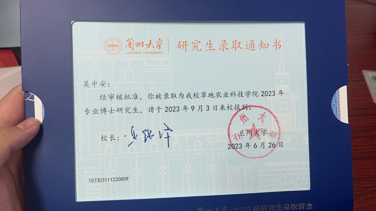 吴中安清楚地知道自己在科研成果和英语方面的薄弱。但他相信勤能补拙。于是,在导师的指导下他静下心,深耕科研,细作论文,苦学英语。但成功之路总是充满坎坷的,种种原因之下,吴中安的第一次考博失利了。但他没有灰心,在亲朋好友们的鼓励下,他重整旗鼓,向博士研究生发起第二次冲击,并针对第一次考博中出现的问题,认真复盘,在复习的过程中着重对研究计划下苦功夫。“有志者事竟成”,命运之神再次向这位勤奋好学的年轻人抛来了橄榄枝,2023年,吴中安成功被兰州大学草业经济与管理专业录取为博士研究生。