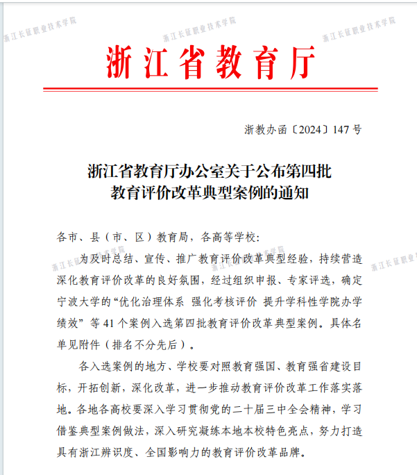 本次评选旨在及时总结、宣传、推广教育评价改革典型经验,持续营造深化教育评价改革的良好氛围,深入凝练办学特色亮点,努力打造具有浙江辨识度、全国影响力的教育评价改革品牌。经各地各校申报、专家评选,共有41个案例入选,其中高职专科院校5个。