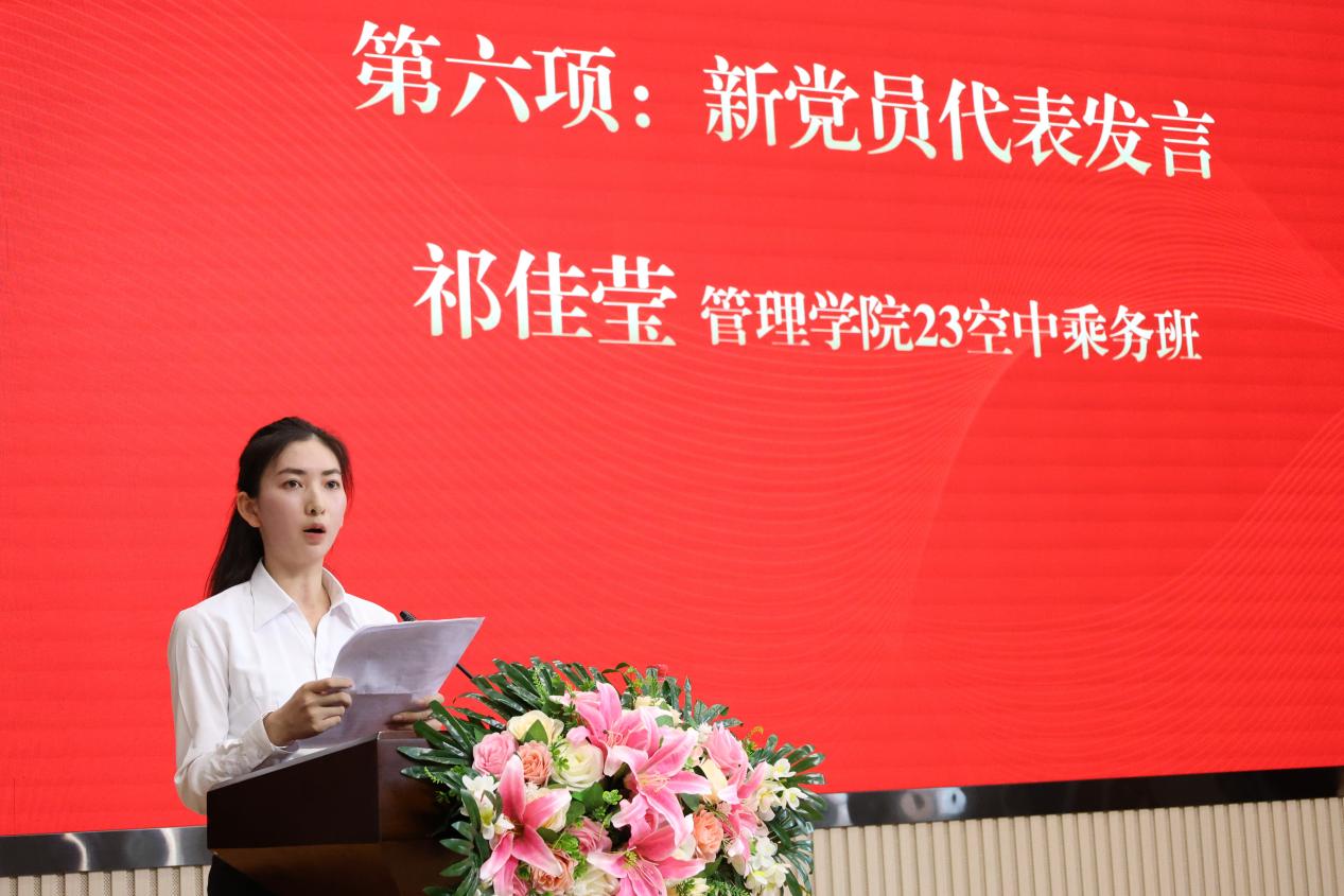 在新党员宣誓环节,19名新党员代表进行了入党宣誓仪式。仪式结束后,管理学院23空中乘务班祁佳莹同学作为新党员代表上台发言,她表示将牢记党的教诲,努力学习,积极工作,为党和人民的事业贡献自己的力量。