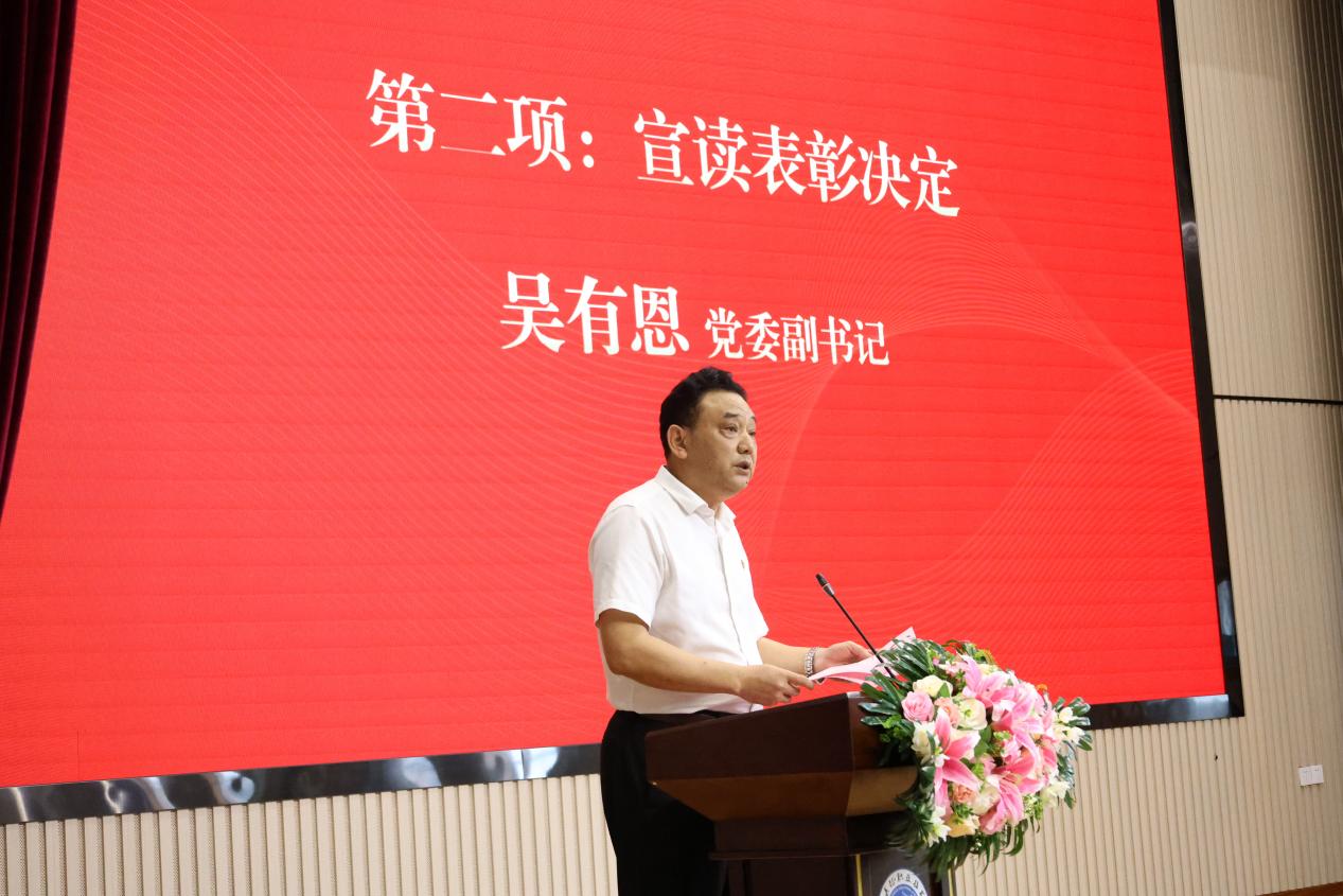 大会在庄严的国歌声中拉开帷幕。在表彰环节,首先由吴有恩宣读《关于表彰2024年度先进基层党组织、优秀共产党员、优秀党务工作者的决定》。授予计算机与信息技术学院党支部等6个基层党组织“先进基层党组织”称号;授予王秋等28位同志“优秀共产党员”荣誉称号;授予过芹芹等11位同志“优秀党务工作者”称号。校领导为受表彰的单位和个人颁发荣誉证书。在热烈的掌声中,校领导向受表彰的先进基层党组织代表和获奖个人颁奖。