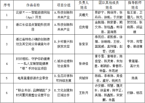 根据浙江省大学生创新创业大赛组委会《关于举办浙江省第十二届“挑战杯”大学生创业计划竞赛的通知》有关文件精神,本着公平、公正、公开的原则,严格履行选拔程序,经学生团队自主申报、各系初评推荐、校专家组评审,推荐6个优秀项目代表我校参加省赛。现予以公示: