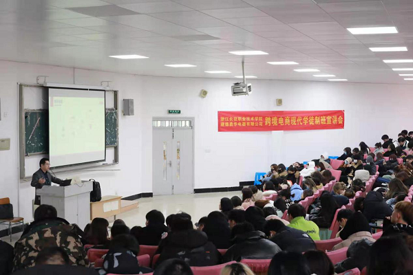 12月23日,我校贸易系与建德市勇华电器有限公司(以下简称:勇华电器)共同举办了跨境电商现代学徒制班宣讲会。勇华电器总经理朱国强、我校贸易系副主任王珍等教师及全体2019级国贸和报关专业的学生参加了宣讲会。