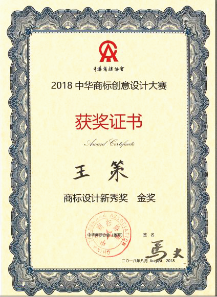 “2018中华商标创意设计大赛 ”由中华商标协会、中国教育电视台共同主办,《中华商标》杂志社、中国教育电视台全国大学生创业教育实习基地承办。大赛历经3个多月的时间,吸引了来自全国包括台湾在内的20多个省份的参赛人员,共收到投稿作品近2000幅,经过大赛评审委员会的初审、复审和终审,最终分别评选出了最具创意设计奖、商标设计创新奖、商标设计新秀奖三个奖项的金、银、铜奖,以及16个优秀商标设计奖。王策同学的作品被评委会专家们一致肯定,获得了商标创意设计大赛新秀奖金奖的好成绩。