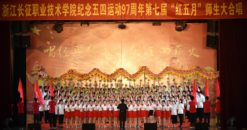 红歌唱响延安精神,党旗飞扬百年辉煌。2016年5月4日下午,我院在体育馆隆重举行了以“唱经典赞歌,传承五四薪火”为主题的浙江长征职业技术学院第七届“红五月”师生大合唱。大合唱邀请了周边共建单位以及各兄弟院校的声乐指导老师担任评委。学院执行院长、正院级巡视员洪永铿,学院副院长杜宝山,党委副书记、副院长王其军,党委委员、工会主席洪骏,党委副书记、纪委书记张乐弟等学院领导出席本次活动。现场1000多名师生一起观看了比赛。