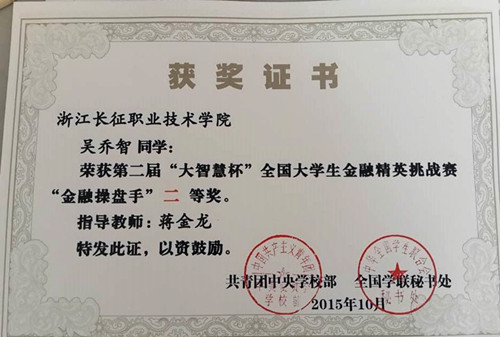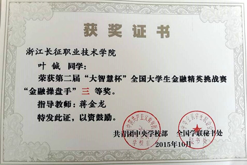经过激烈角逐,我院吴乔智、叶铖二名同学在蒋金龙老师指导下脱颖而出,荣获全国大学生金融精英挑战赛个人二等级、个人三等级,我院教师蒋金龙在本次比赛中荣获高校金融操盘手指导教师二等奖我院学生事务中心参赛团队荣获“卓越组织”称号。(学生处供稿)
