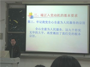 在将近一小时的授课过程中,洪骏老师提出,希望同学们能够把握好机会,通过自身的努力争取早日进入党组织。而后他又向学员们详细介绍了入党的内在原因和真实目的,列举了大学生入党的不良动机,剖析了不良入党动机的成因并提出了端正入党动机的三个基本要求。