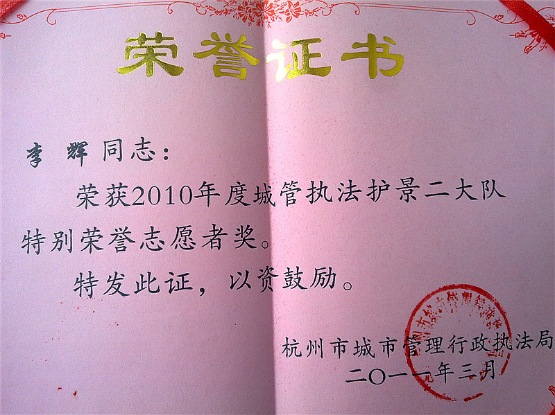 2011年3月,我院志愿者李辉荣获杭州市城市管理行政执法局颁发的“2010年度城管执法护景二大队特别荣誉志愿者奖”。为此,杭州市城管执法护景大队队长高翔特地把奖状送至我院,向我院领导对志愿者工作的支持表示感谢,并对我院志愿者做了极高的评价。
