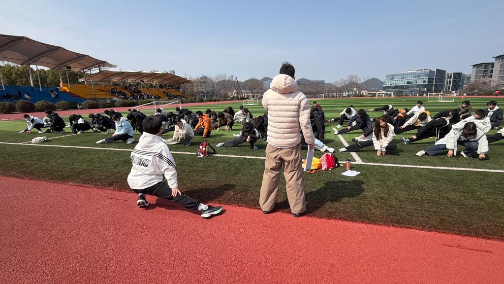 活动开始前,学生在体育老师的指导下规范完成热身训练,依次进行关节活动、腿部及肩部拉伸等动作,为运动安全筑牢基础。活动期间,全体学生精神饱满、步履铿锵,沿指定打卡点有序行进,同窗之间相互鼓励、结伴前行,春日校园里,青春的身影勾勒出活力满满的风景线,尽显青年学子的蓬勃朝气。
