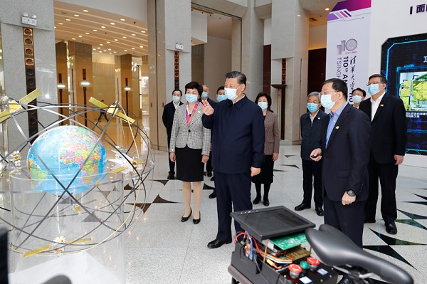 清华大学主楼二层,展示了学校近年来重点教学科研成果。习近平听取了关于增强自主创新能力、助力世界主要科学中心和创新高地建设、提高人文社会学科教育研究水平等情况介绍,对清华大学取得的成绩给予充分肯定。习近平指出,要坚持中国特色社会主义教育发展道路,充分发挥科研优势,增强学科设置的针对性,加强基础研究,加大自主创新力度,并从我国改革发展实践中提出新观点、构建新理论,努力构建中国特色、中国风格、中国气派的学科体系、学术体系、话语体系。