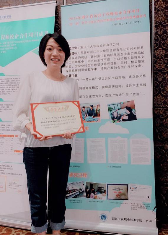 2019年10月17日,由浙江省高等教育学会高校(高职)师资管理分会主办的2019年度高校访问工程师校企合作项目成果交流评审会在浙江工贸职业技术学院举行,我校贸易系平萍的“‘一带一路’背景下浙江省纺织服装外贸企业转型升级战略研究”项目经评审获得二等奖。