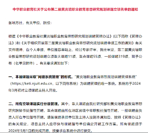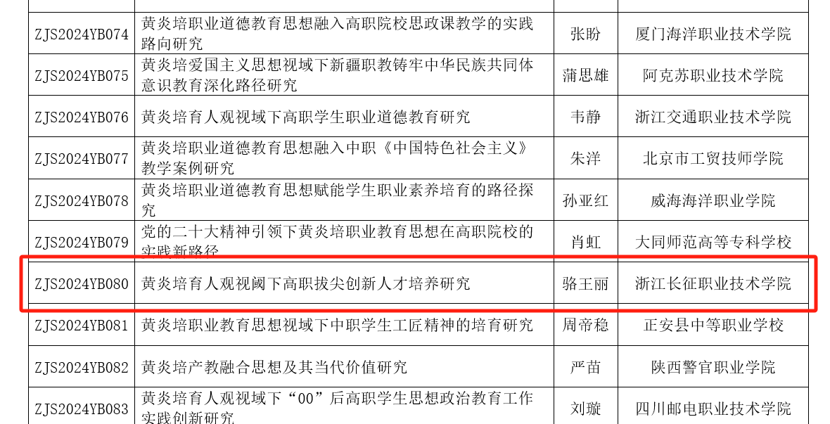 2024年3月4日,中华职业教育社公布了第二届黄炎培职业教育思想研究规划课题立项名单,浙江长征职业技术学院管理学院骆王丽老师的《黄炎培育人观视阈下高职拔尖创新人才培养研究》(课题编号:ZJS2024YB080)和商贸学院柴畅老师的《黄炎培美育观视域下高职院校以美培元的美育课程模式创新研究》(课题编号:ZJS2024YB265)成功立项。