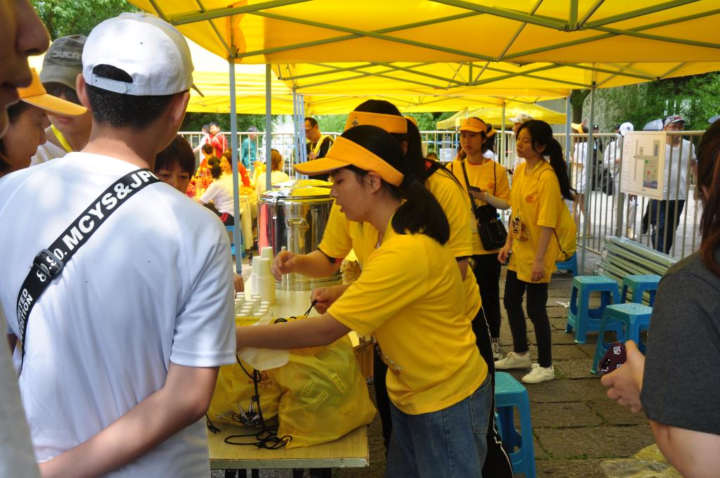 主会场1主会场的志愿者正在为参赛成员们发放食物、水果、水等,帮助他们尽快恢复体力